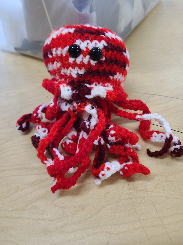 Sadie isn’t great at starting new things, especially if she can’t get it right instantly. She realized pretty quick that if she didn’t pull herself together and understand that learning is a process, she wouldn’t get anywhere. It took time, but eventually she learned how to do a single stream of chains, the foundation of most crochet projects. From there, she threw myself into her first big project. The jellyfish here was that project!! It took weeks upon weeks to finish, hours spent in class and at home working away. She vividly remembers when she finished this, it was right at the end of second term, and specifically right before marks cut off. Sadie was determined to get the jellyfish done and handed in for marks. In the end, she technically didn’t finish it’s marking sheet before the bell rang, but her teacher let her stay the few minutes she needed to get it finished and handed in. Sadie was so proud of herself.