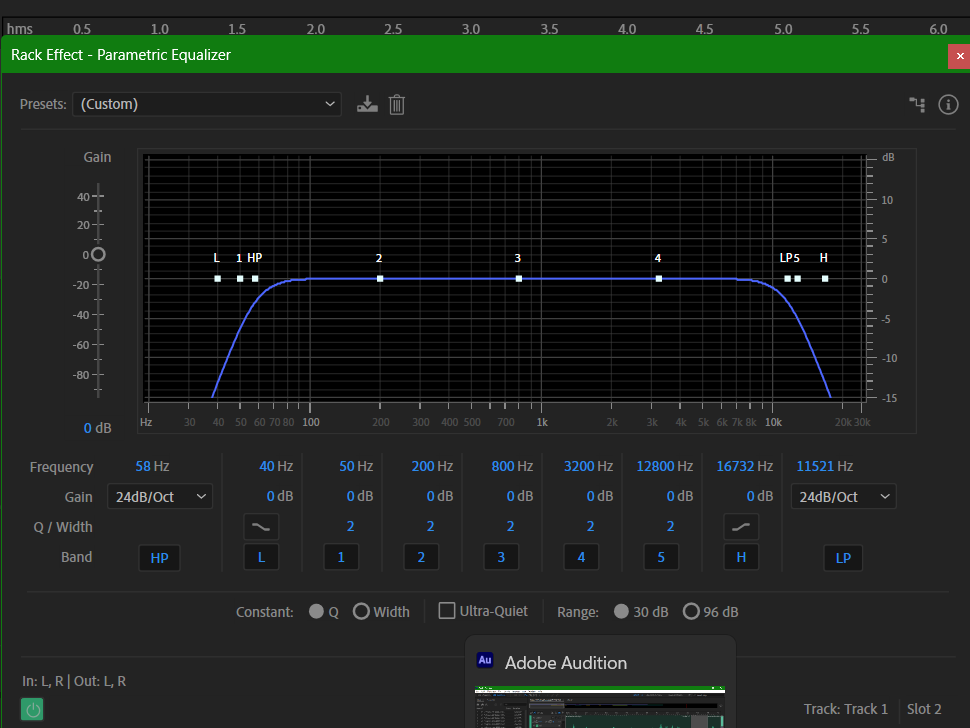 Another important effect taught in my Sound Design class was EQ’s! The panel for this is a bit more confusing, and when working with it, can make your audio sound a little distorted before finding the right spot. EQ helps with frequencies. It allows me to slowly adjust and cut off specific frequencies, high or low, to make it so it’s not very squeaky or super bass heavy.